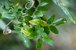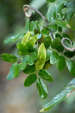 Lá kép lông chim một lần lẻ, lá kép mọc cách có lá kèm nhỏ sớm rụng, dài 10 - 20 cm mang 9 - 13 lá chét. Lá chét hình trái xoan đuôi gần tròn hơi lệch, mép nguyên mặt trên xanh bóng, mặt dưới bạc; gân lá lông chim.